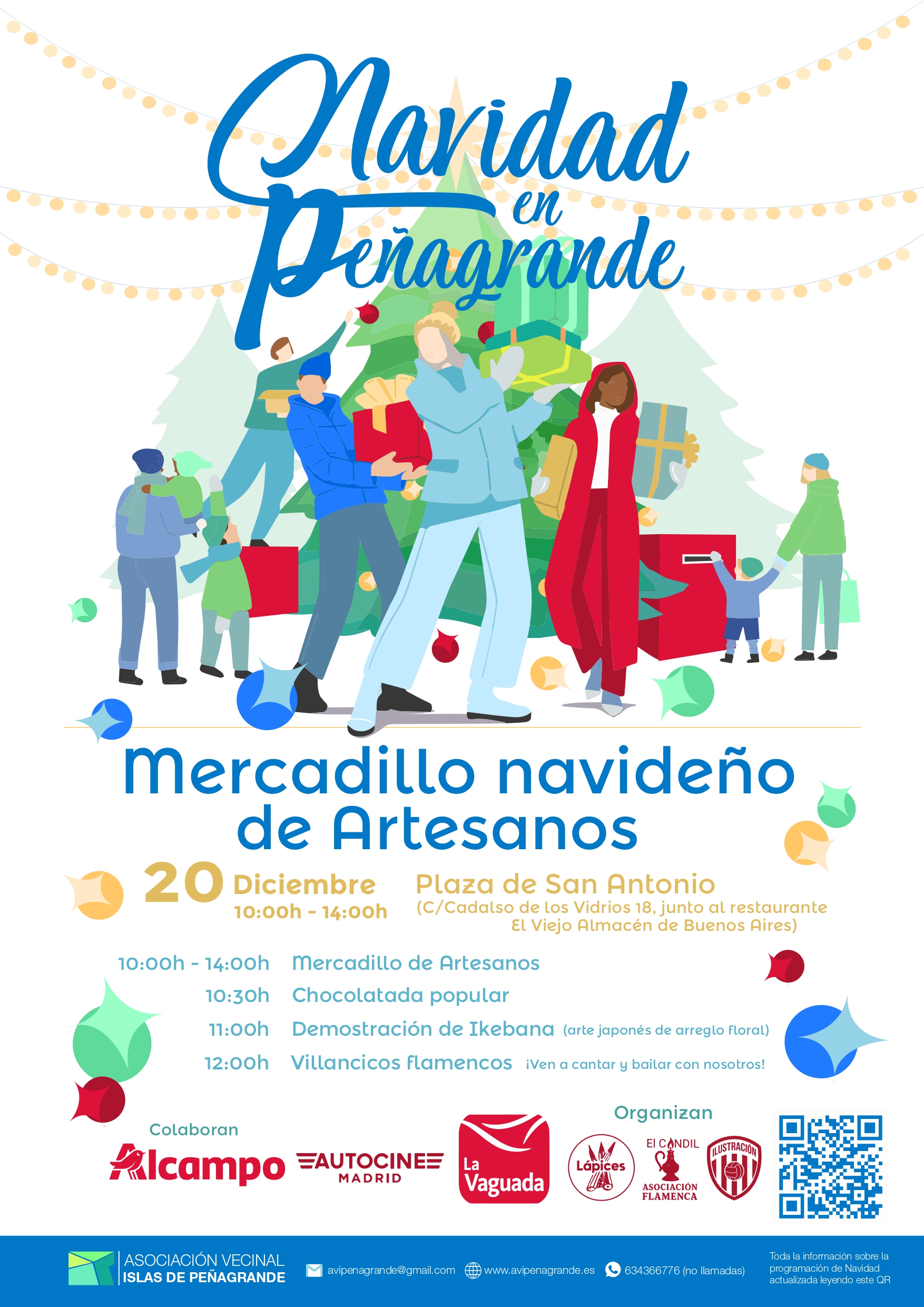 La Asociación Vecinal Islas de Peñagrande organiza el Mercadillo Navideño de Peñagrande, un evento abierto al público para apoyar a los artesanos y creativos del barrio y del distrito de Fuencarral-El Pardo. El objetivo es ofrecer un espacio donde exponer y vender creaciones artesanales y dinamizar la vida del barrio durante la Navidad.